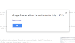 PS Wie een oplossing zoekt voor het stopzetten van Google Reader, raad ik aan om het blog van Raymond te volgen. Gegarandeerd dat hij de komende tijd met oplossingen komt en dingen gaat uitproberen. Informatie categoriseren en verzamelen is tenslotte zijn Vak (blog).