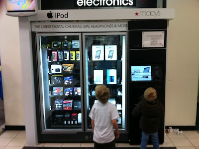 Voor wie het niet ziet: dit is een soort vending machine, een snoepautomaat, maar dan gevuld met iPads en fototoestellen en andere gadgets. Prijzige gadgets.