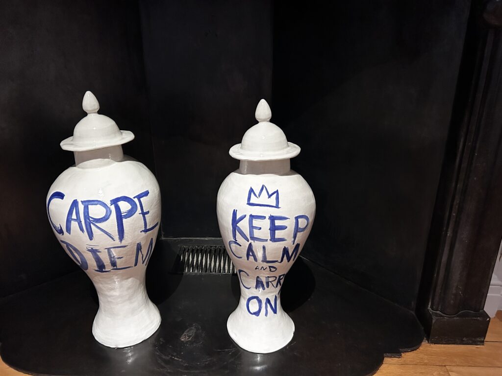 PS Ik maakte een foto van twee vazen, ergens in een van de ruimtes. Ik moest er om lachen. De vorm is zo 17e-eeuws, de teksten niet. Ze stonden pontificaal in een prachtige, oude ruimte die 17e-18e eeuw ademde. Er stond geen bordje bij maar de andere aardewerken kunst, op de gang ernaast, was van deze man. Dus ik denk dat dit er bij hoorde.