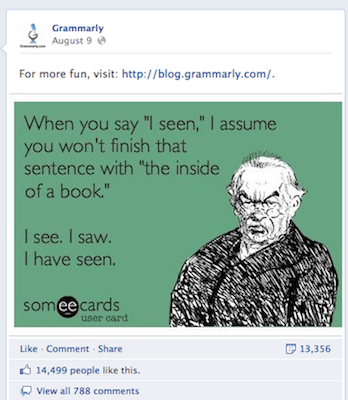 Je kunt als slimme website dankzij Facebook een enorme impuls krijgen. De website Grammarly biedt dagelijks een kritische maar vooral humoristische kijk op het gebruik van grammatica (in de VS). Dat valt bij veel mensen duidelijk in goede aarde.